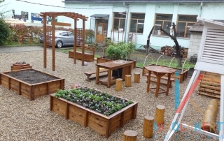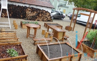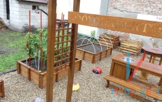 A rendelkezésre álló közel 50m2-es területen egy komplett kertet sikerült megvalósítanunk. A gyerekek 4 db magaságyásban kertészkedhetnek, melyek közül egy fóliával védett, lehetővé téve a minél korábbi kertművelés elkezdését. A játékos ismeretszerzés, de egyéb kinti programok kiváló helyszíne a kert közepén létrehozott „beszélgetős-tér, ahol egy magasított asztalon bemutatható az aktuális téma, amit a kicsik az U alakban kialakított padokokon kísérhetnek figyelemmel. A padok egy része nyitható, hogy mindig kéznél legyenek a legszükségesebb szerszámok. A kert gyümölcseit a csappal ellátott munkaasztalon lehet feldolgozni, az aktuális időjárási jelenségek pedig az ún. angol-házikóban elhelyezett műszerek segítségével követhetők nyomon.